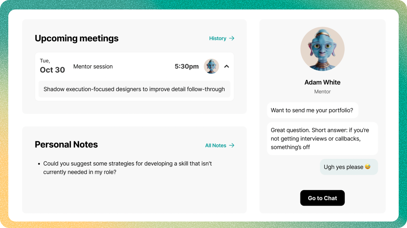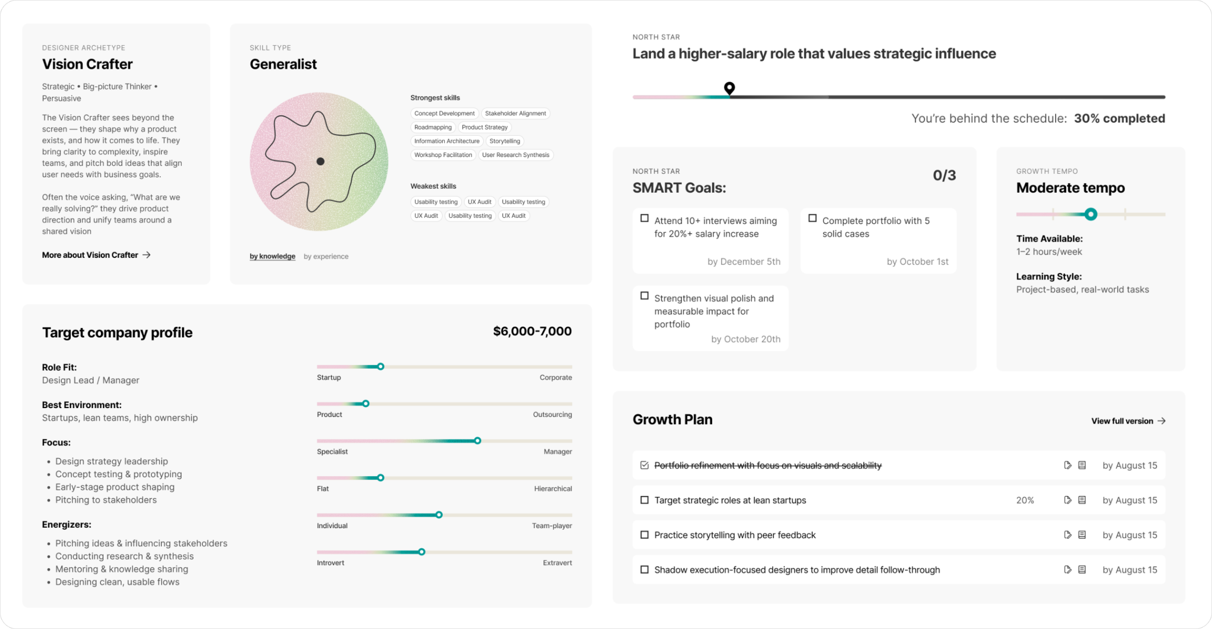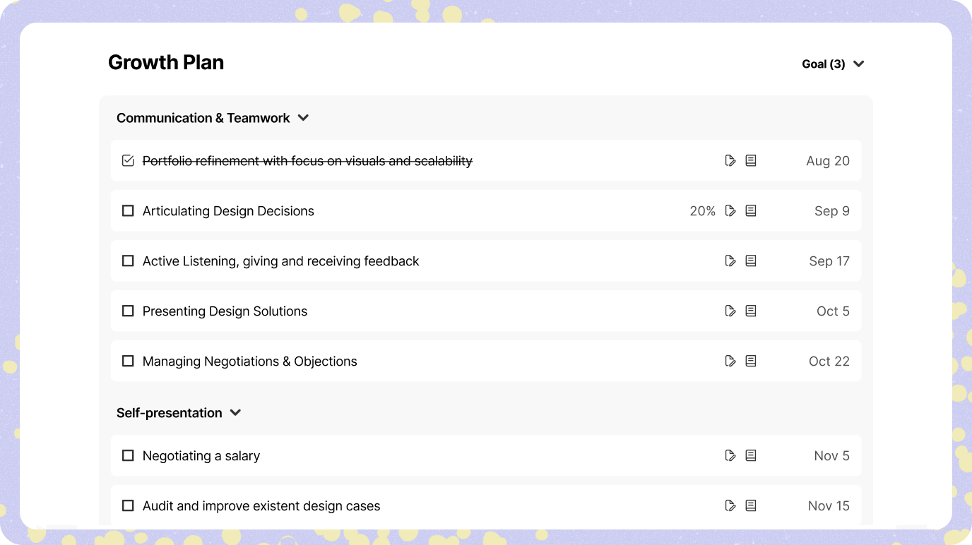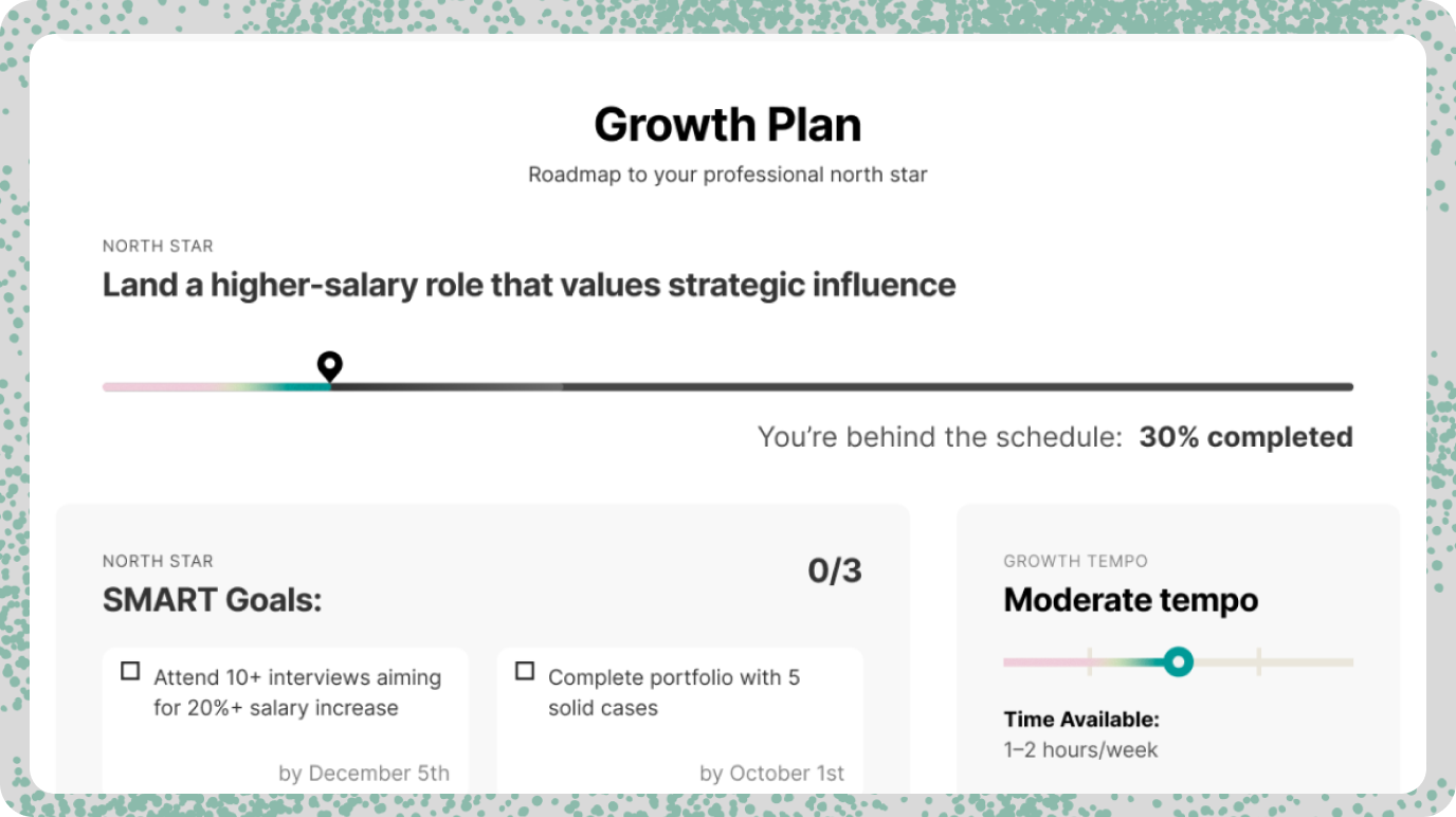 You get a structured growth plan aligned with your goals — switching jobs, getting promoted, improving specific skillsets, etc.