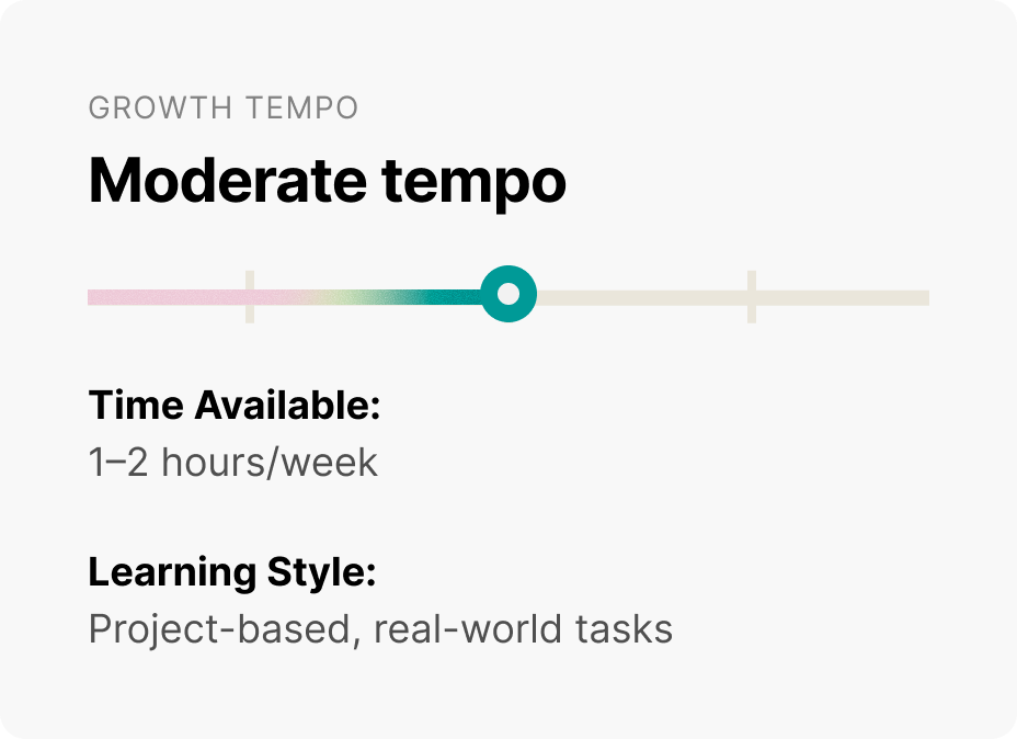 You take a quiz. We show strengths, gaps, and build your plan specifically for your goals. Want to land a new job, level up at work, or switch focus? The plan adapts to that.